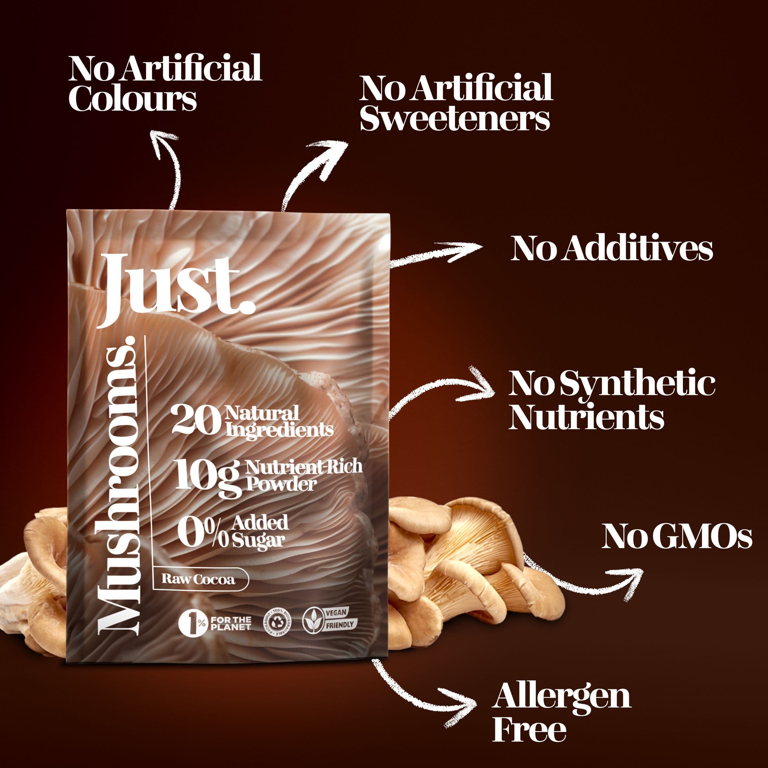 Just. Mushrooms has a rich cocoa base, offering a warm and earthy hot chocolate flavour with natural sweetness from monk fruit. While it’s not overly sugary like a dessert drink, it’s smooth, satisfying, and crafted to complement your health goals. The mushrooms are expertly blended, so you get all their benefits without any mushroom taste—just a nourishing, subtly sweet beverage you’ll enjoy as part of your daily routine.